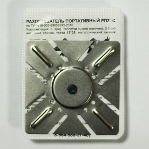 Комплектация: 3 таблетки сухого горючего, металлический таганок. Инструкция по использованию разогревателя портативного РП3Т. 1. Удалить кнопку и рассоеденить таганок и контейнер с таблетками. 2.Отогнуть пластины металлического таганка, расположенные по диагонали квадрата, на 90град. в сторону углкбления под таблетку. 3. Отогнуть пластины металлического таганка, расположенные по сторонам квадрата, на 90град. в противополоную сторону. 4.Извлечь таблетку сухого горючего и поместить ее внутрь металлического таганка. 5. Зажечь спичкой таблетку сухого горючего. 6.Установить над таганком кружку с водой или консервы и разогреть до готовности. Разогреватели должны храниться в сухих помещениях при температуре не выше +40С, относительной влажности воздуха не более 85%.