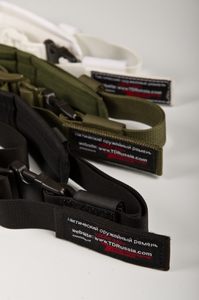 На ремне предусмотрена пряжка для экстренного сброса оружия. Передний карабин пришит малошумным способом.