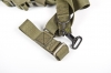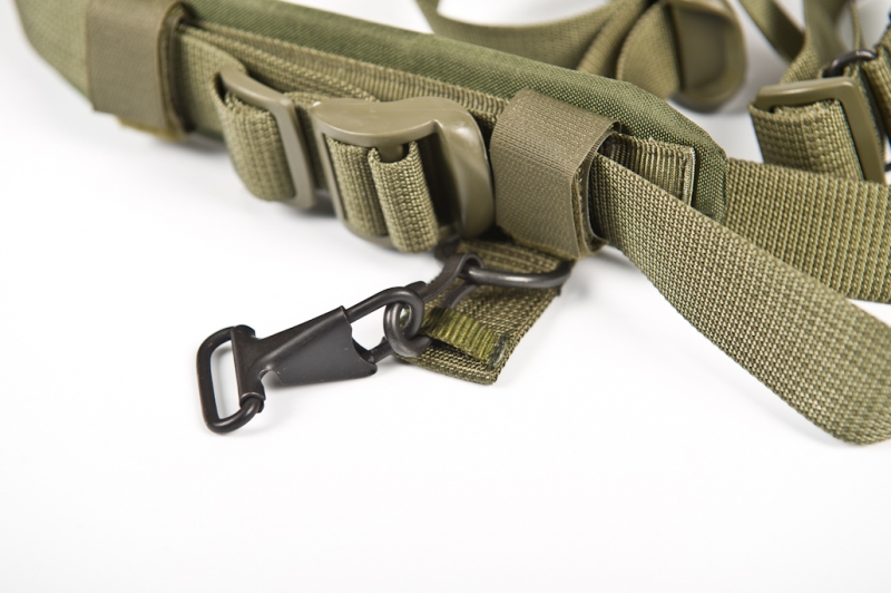 На ремне предусмотрена пряжка для экстренного сброса оружия. Передний карабин пришит малошумным способом.